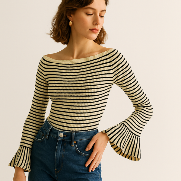 Striped Rib-Knit Top | Off-Shoulder | Flared Sleeves