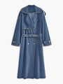 A contemporary rework of the classic trench, this denim coat by Isavara merges relaxed tailoring with modern ease. Its long, fluid silhouette and double-breasted front create an effortlessly refined look, while the adjustable belt allows for a defined waist when desired.