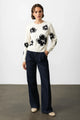 This statement knit sweater redefines casual elegance with bold graphic appeal. Crafted in soft cream knit, it features large black floral motifs that bring structure and contrast to its relaxed silhouette. The medium-weight texture offers warmth and comfort without compromising refinement.