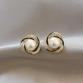 A sculptural pair of earrings combining luminous faux pearls with a radiant crystal-set frame. The rose-inspired design captures a soft elegance that frames the face with subtle light.