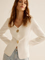This Isavara fitted blazer embodies understated sophistication. The clean V-neckline and sculpted waist create a refined, feminine shape that flatters the form. Gold buttons add a subtle statement to its minimalist tailoring, balancing polish with modern ease.
